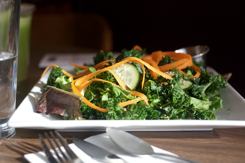 I appreciated that the salad was made with two types of kale: curly and lacinato, which looks purple. The menu advertised the dish as a “massaged kale” salad. Massaging kale softens the leaves, making it more pleasant to chew, but I couldn’t detect any pre-massaging done to this kale. The salad also featured carrots, cucumbers and tough, almost-burnt shitake mushrooms.