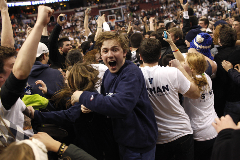 Villanova’s student sections, located on both sides of the court, began pushing their way to the edge of the court, toppling chairs and knocking over tables.
