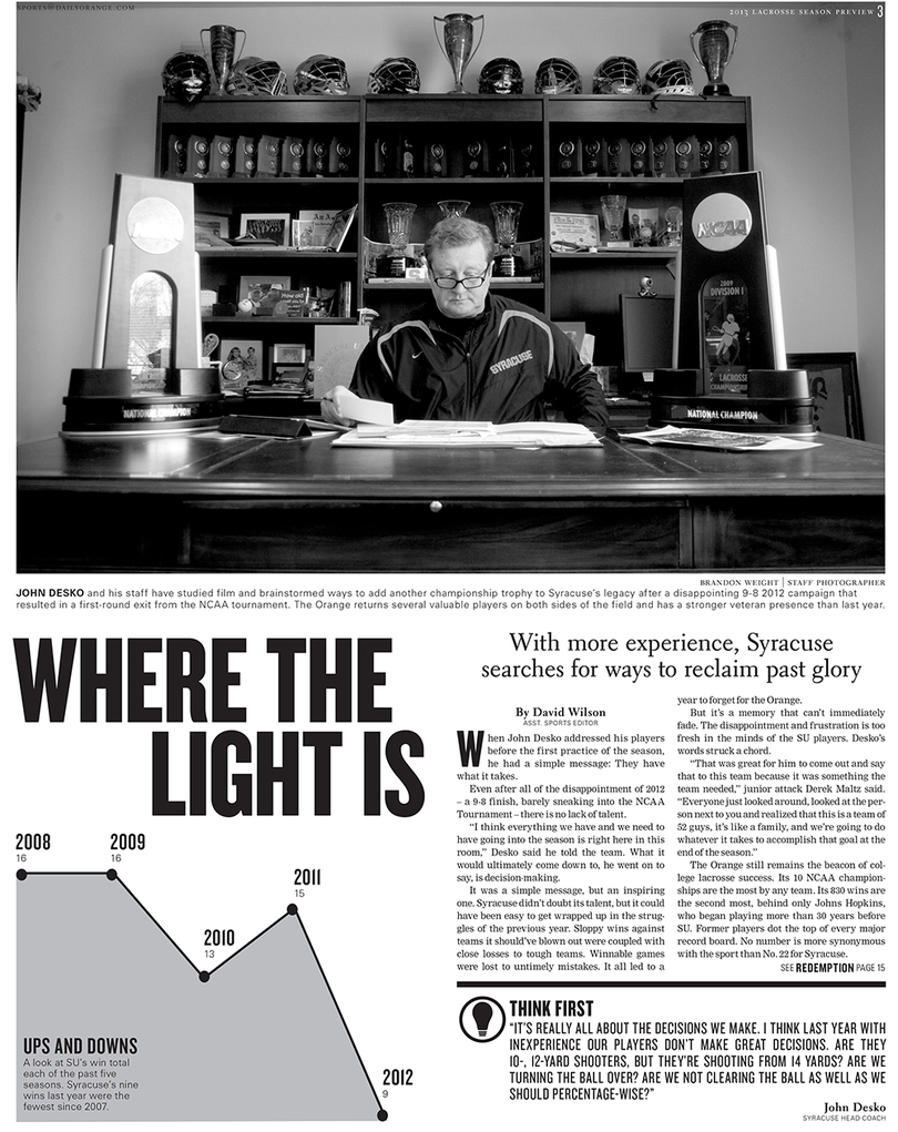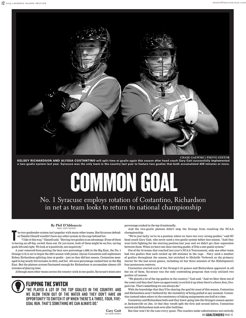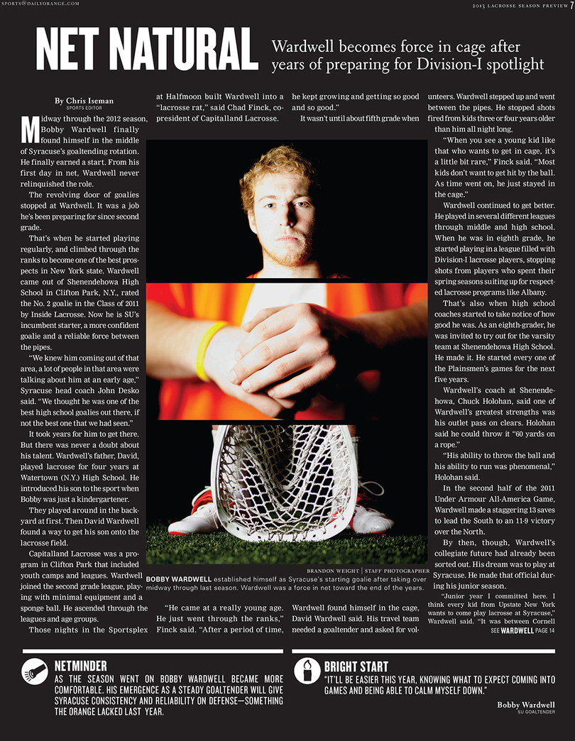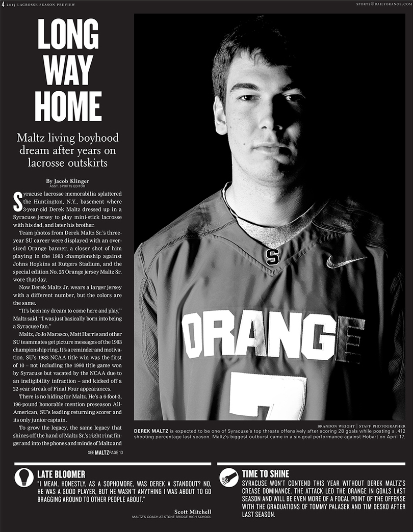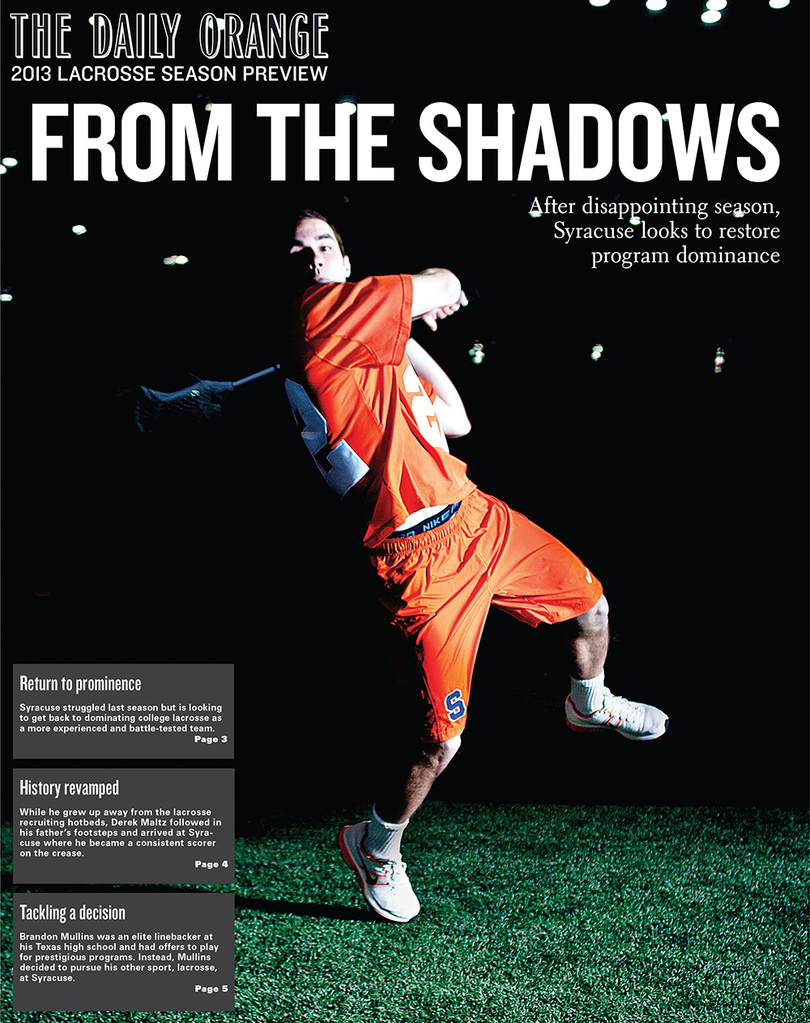 The 2013 lacrosse season preview guide provides an in-depth look at both the men’s and women’s teams. We hope you will enjoy reading about Syracuse’s determination to rebound from a disappointing season last year, an extensive profile on attack and leading goal-scorer Derek Maltz, a look at defender Brandon Mullins’ decision to spurn an offer to play football at Notre Dame and a look at how goaltender Bobby Wardwell grew into a force in net. There is also a story that look at the changing offensive philosophy taking place at Providence, as well as one that breaks down the emergence of Loyola into the national spotlight. The guide also includes a look at the goaltending duo anchoring the Syracuse women’s lacrosse team. We hope these stories provide all the information you need as the 2013 lacrosse season gets underway.