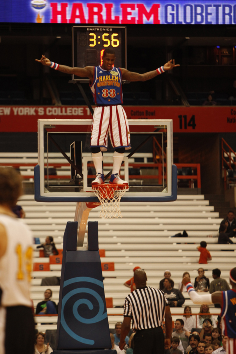 “He wins a brand new Toy…Yoda,” Big Easy said, unveiling a miniature toy Yoda and handing it to Scooter, as members of the crowd cracked up at the atrocious word play and classic Globetrotter shtick. That was one of many sensational highlights fused with comedic ploys Friday night at the Carrier Dome, as the Harlem Globetrotters knocked off the Global Select 114-100 to win the World Cup Championship trophy.
