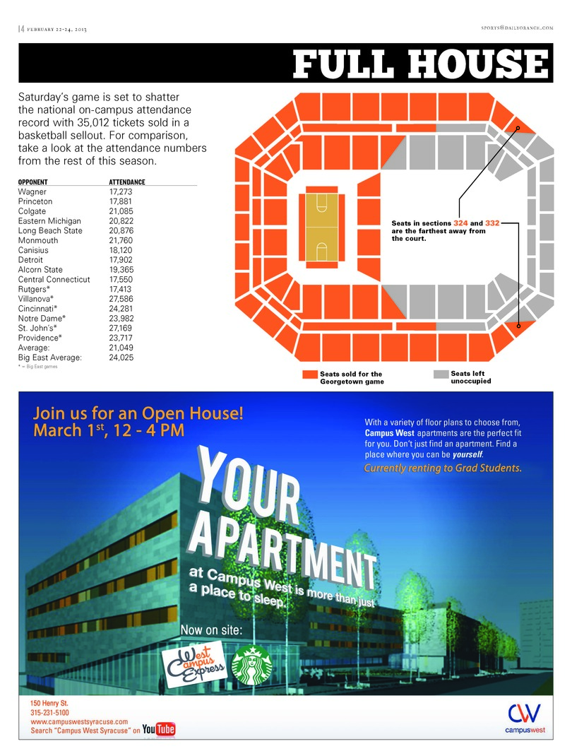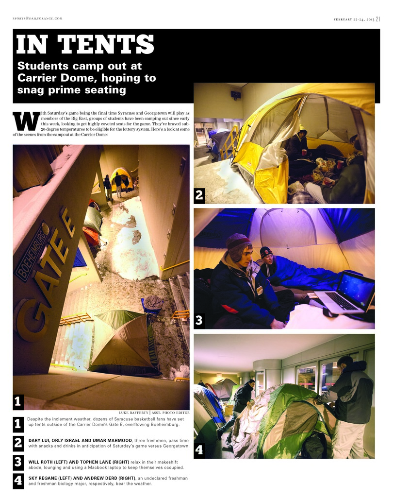 Pick up a copy of The Daily Orange’s preview of the game or read the stories online. Read about some of the historic moments of the rivalry, from the top games to the all-time starting lineups to a heated, physical matchup in the 1984 Big East championship. This year’s game, the first of two meetings between the teams, comes at a time when both teams are rising in the rankings. Read a column by sports editor Chris Iseman about the importance of the rivalry continuing beyond the Big East. And watch and listen to the students camping out at Boeheimburg waiting to attain prime seating for the historic matchup.