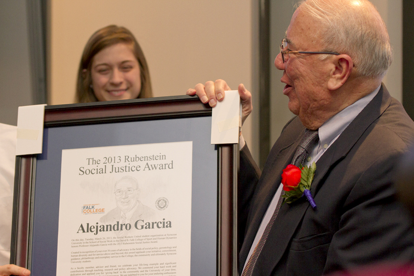 Now, as a professor in the School of Social Work at Syracuse University, Garcia’s own altruistic actions are being recognized with the 2013 Daniel and Mary Lou Rubenstein Social Justice Award. He received the award on Tuesday for his 35 years of teaching on diversity and social policy, as well as his social work on local, national and international levels.