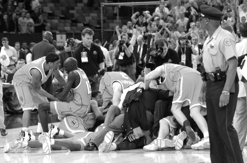 Then, on the ensuing possession, Hinrich missed a layup, and the Jayhawks lost the ball out of bounds. Anthony drilled a 3-pointer on the other end, giving the Orangemen a 53-40 lead.
