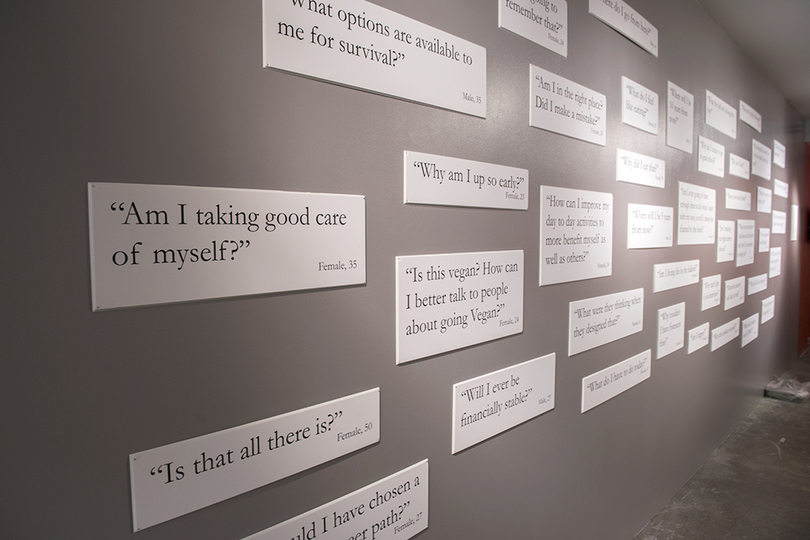 Incorporating questions and answers from individuals currently living today is meant to make visitors consider questions on both a societal and personal level, said Erica Jensen, a student in the class who worked on constructing the gallery and promoting it across campus.