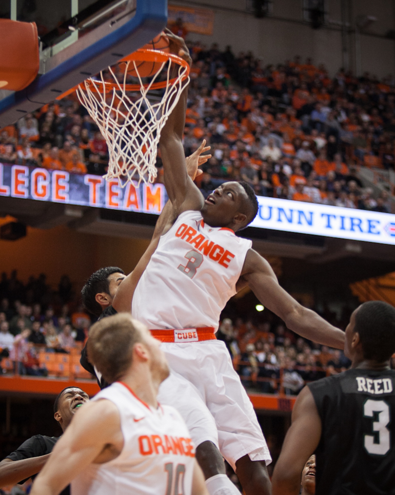 And as the game continued into the second half, Syracuse flashed all the reasons that it will likely stake a claim as the No. 2 team in the country on Monday. Cooney hit five 3-pointers. DaJuan Coleman logged another double-double and grabbed six offensive boards. Fair was an efficient 8-of-15. Grant turned in 14, five and five. Michael Gbinije dished out five assists to just one turnover.