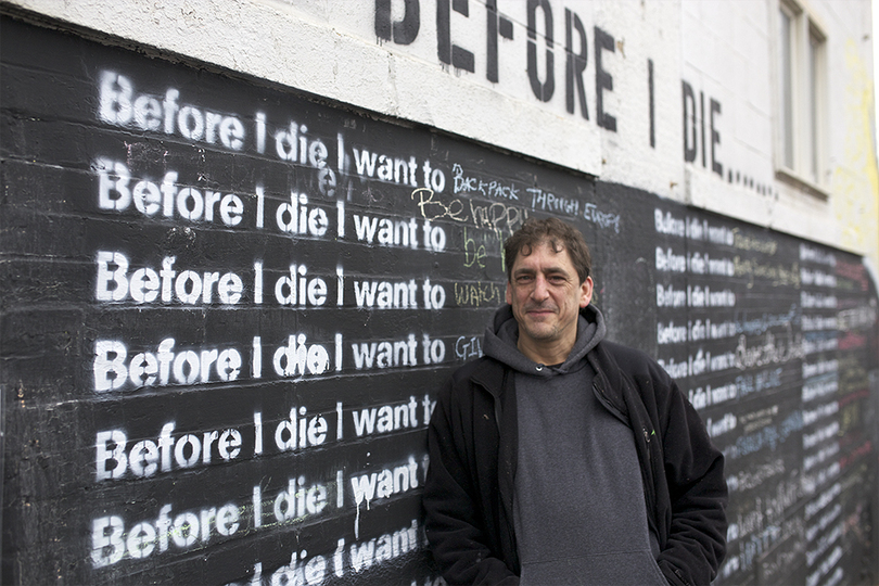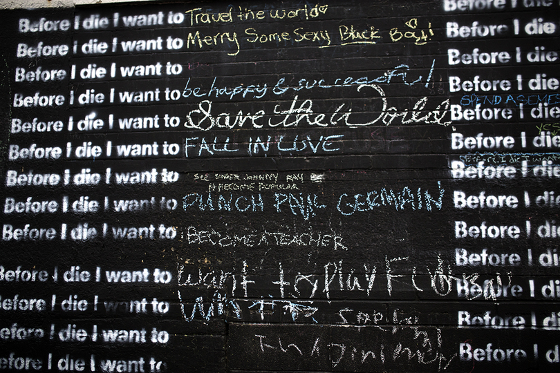 The wall was simple in concept: take the side of an abandoned building, a construction site or even a piece of plywood, paint it with chalkboard paint, stencil on the sentence “Before I die I want to…” and wait for the responses to start rolling in.