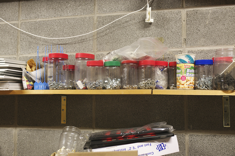 Reeder’s office now is located in Day Hall, brimming with cords, boxes of bulbs and jars of screws, nuts and bolts. He likes using Jiffy jars, his favorite type of peanut butter, for storage but uses emptied bean cans too.