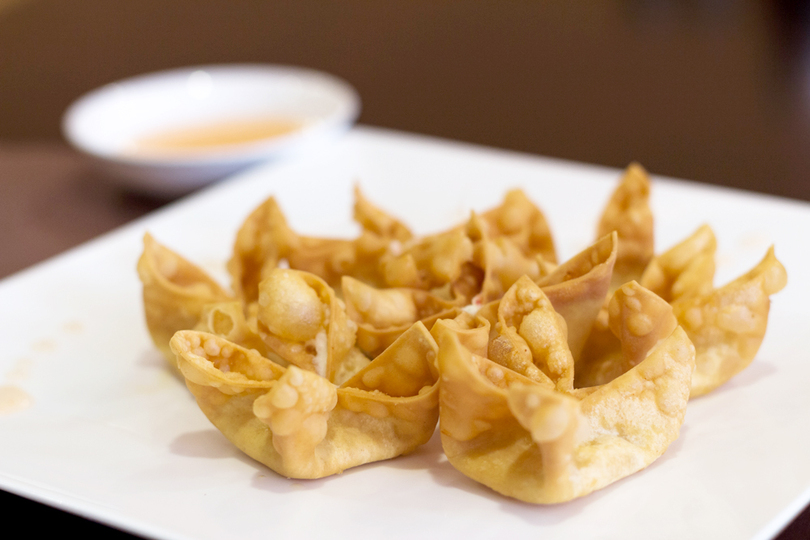I started off with crab Rangoon, a fried appetizer that’s typically wonton sheets wrapped around a mixture of crabmeat and cream cheese. The edges of the wrappers are sealed together using egg whites, which is crucial, since otherwise the filling would ooze out while deep-frying it.