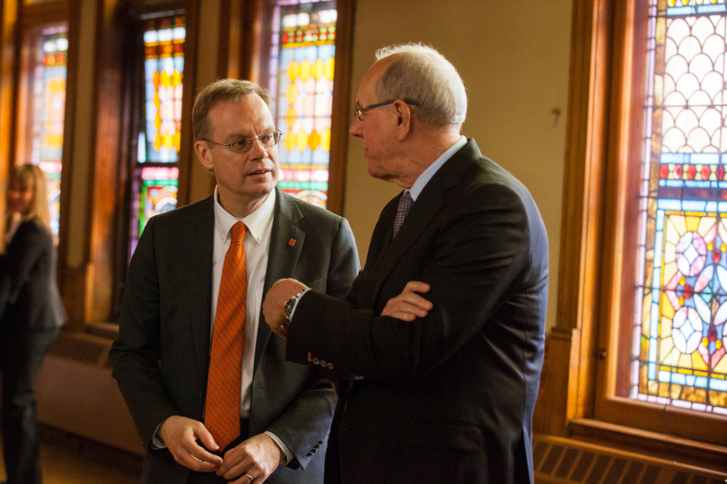 By about 10 a.m., Syverud swapped his running shoes and gym shorts from his run across campus that morning for a suit and orange tie to attend “Great Universities in the Next 25 Years,” an academic symposium held in Setnor Auditorium. The symposium was one of four other events held that day to celebrate Syverud’s appointment as SU’s 12th chancellor.