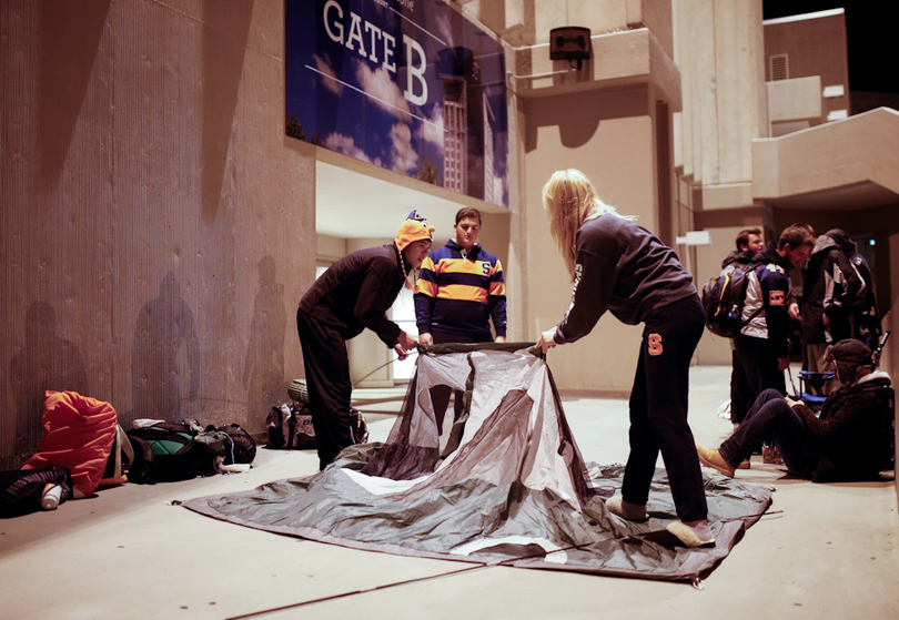 Students began lining up outside the Carrier Dome as early as midnight on Monday as temperatures dipped below 50 degrees. There were 200 bus vouchers available to student season ticket holders on Tuesday, and about 130 students were there at 6:45 a.m. when the Carrier Dome Box Office opened.
