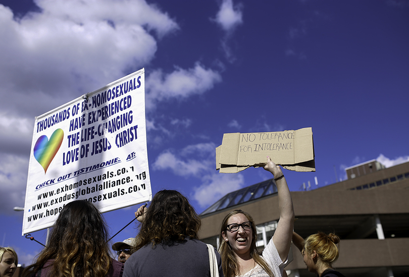 The protest began when a few students walked by Jim Deferio, a Syracuse man who said he arrived at 12:12 p.m. and was preaching near the back of the Schine Student Center. Abby Leigh Charbonneau, a junior anthropology and creative writing dual major, said she walked by Deferio, who was wearing an “I heart Jesus” hat, and was holding a sign that was intolerant of the gay community.