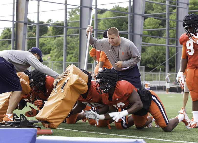 They were. But they also absorbed the shock of head-to-head collisions and softened helmet-to-body hits. SU has 80-100 of the soft-shell helmet covers that offensive coordinator Tim Lester helped bring to Syracuse after introducing the product to Elmhurst College in 2012 as the Bluejays’ head coach.