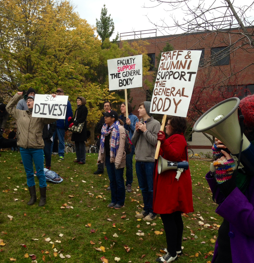 Protesters outside also held signs that read, “Faculty support THE General Body” and “Staff & alumni support THE General Body.”