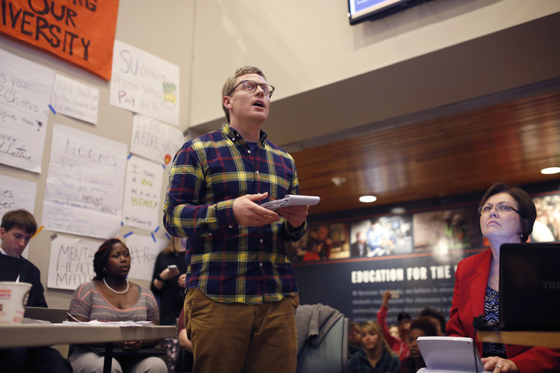 Ben Kuebrich, a compositional and cultural rhetoric PhD candidate, introduced the discussion of changes to the mission and vision statement at SU. Kuebrich asked for the proposed vote on the statements at the Board of Trustees meeting Thursday and Friday to be postponed. He cited a lack of discussion as a reason for why the vote should be postponed.
