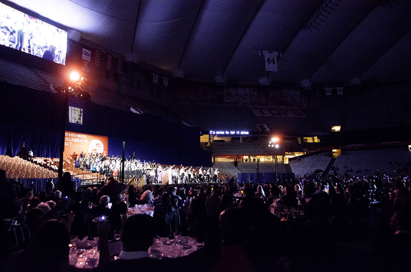 Attendees spent the first half of the evening enjoying dinner and chatting at tables that spanned half of the Carrier Dome field. On each table was a postcard from Norris’ Race Card Project, which encourages people to candidly describe their experiences with race and cultural identity in six words or less.