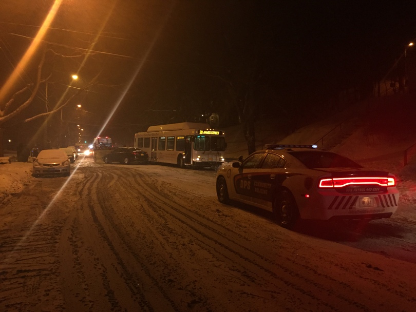 A Route 20 James Street bus was diagonal on Euclid Avenue near Lancaster Avenue for about 20 minutes following a two-car accident. The bus was not involved in the accident, and it was only in the position it was because it got out of the way of the accident, said an officer with the Syracuse Police Department who was on the scene. Nobody was hurt in the accident and only one of the cars involved had damage, the officer said.