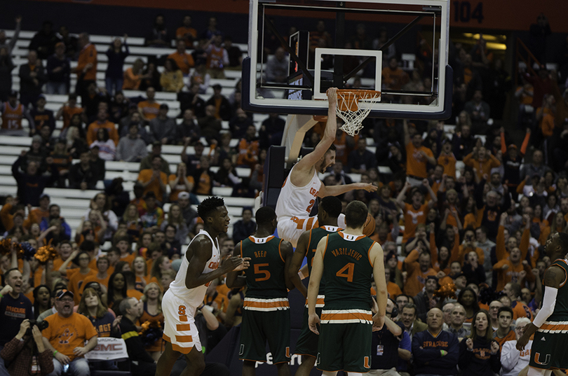 Three days after a double-digit loss to Boston College, Syracuse (9-6, 1-1 Atlantic Coast) beat Miami (11-3, 1-1) Wednesday night in the Carrier Dome. The Hurricanes had won seven straight and received 16 votes in the latest Associated Press Top 25 poll. On Sunday, Syracuse became the first ACC team to lose to Boston College in almost two years. Yet the Orange rode a strong defensive effort to victory against Miami in front of 17,393 fans. Here are the best scenes from the matchup.