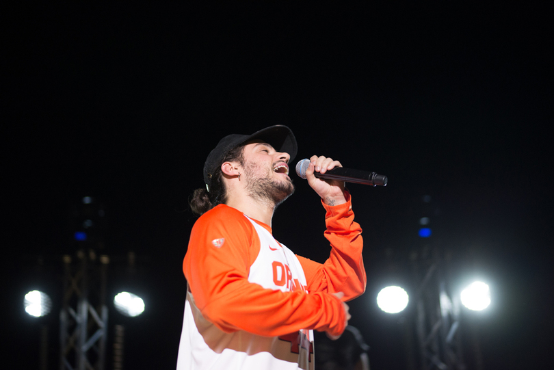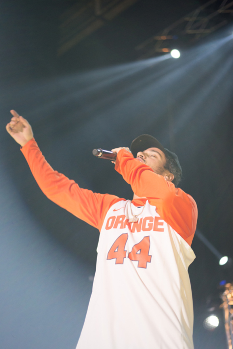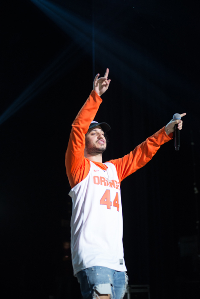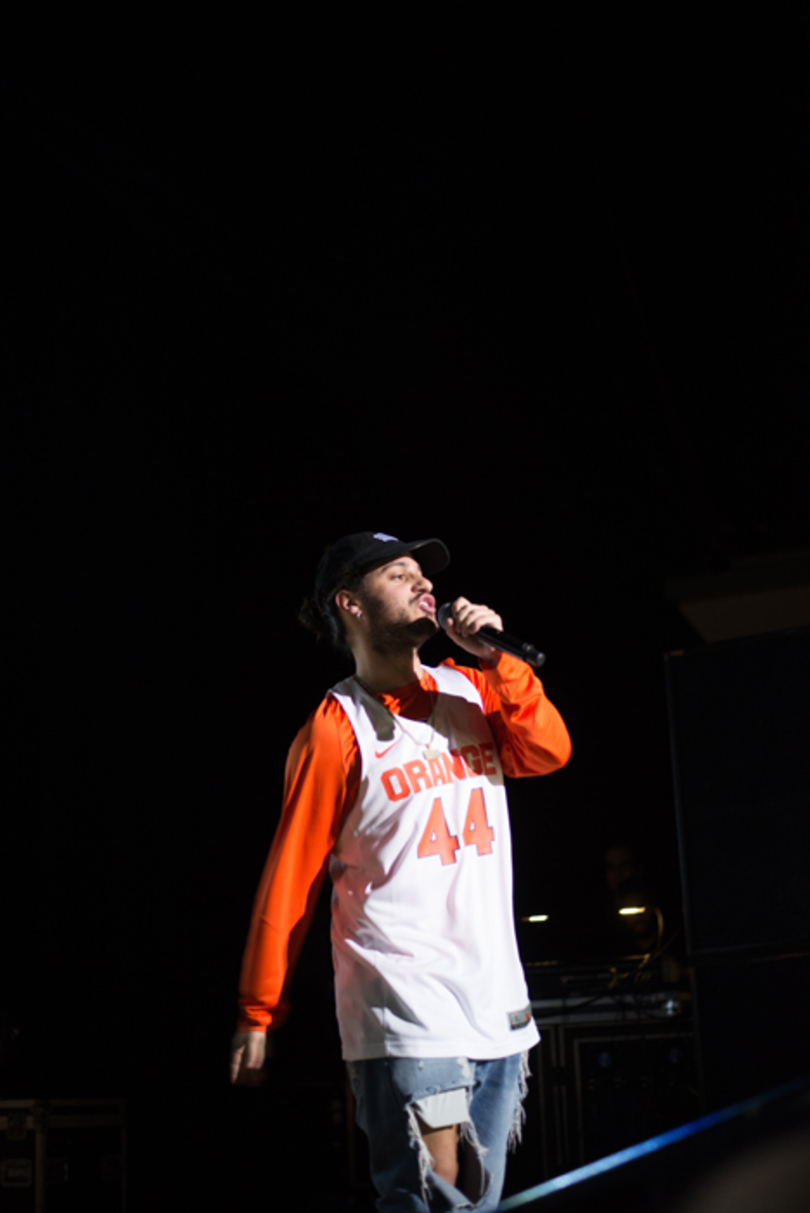 While the energy in Goldstein Auditorium was almost tantalizingly high, it only increased when Russ arrived. His silhouette on the dark stage was enough to get the crowd screaming, but when the lights came on revealing his Orange basketball jersey, the screaming got impossibly louder. The crowd was so loud that the first 30 seconds of every song was just short of inaudible, and it only took until the second song of the set, “Do It Myself,” for the crowd to reach the peak of their excitement.
