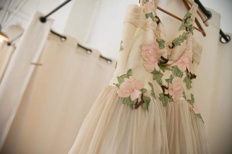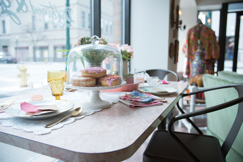 But their store is a contemporary take on old-fashioned. The room is vibrant with simple walls that make colorful hues of green and bubblegum pink pop in the room. A shelf with vintage “Saturday Night Fever” and “Thriller” vinyls sit on a shelf. A rack of jackets hangs on one side, displaying everything from velvet to sequins. On the other side of the room sits an ornamented table adorned with light pink flushed flowers, gold table settings and fresh donuts in a glass cake dome.