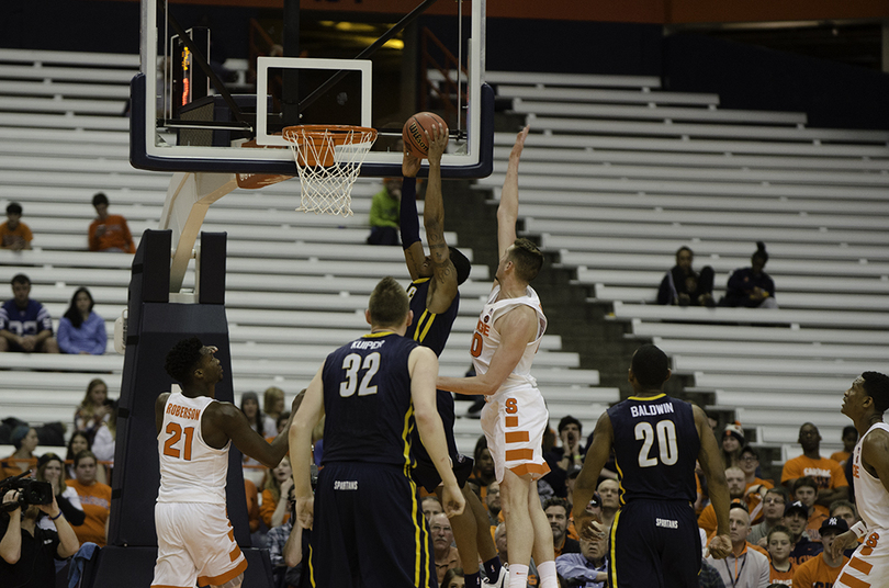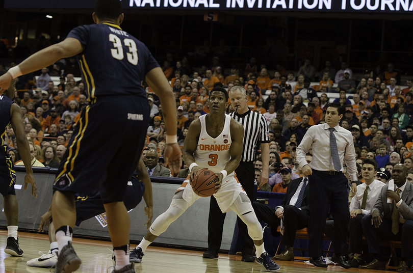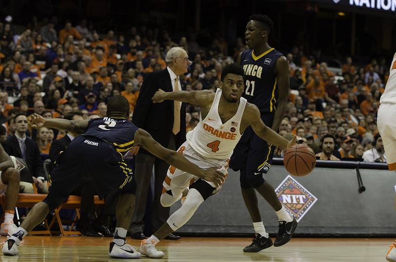 Four Syracuse players scored in double digits to heave the National Invitational Tournament No. 1 overall seed Orange (19-14, 10-8 Atlantic Coast) over its NCAA Tournament disappointments to dispatch the North Carolina-Greensboro Spartans (25-10, 14-4 Southern), 90-77, on Wednesday night. In front of a crowd whittled to 4,288 by it being a Wednesday night, on the campus of a university closed due to intense snow and, well, the NIT itself, SU escaped and set up a second-round matchup against Mississippi on Saturday at 11 a.m. in the Carrier Dome.