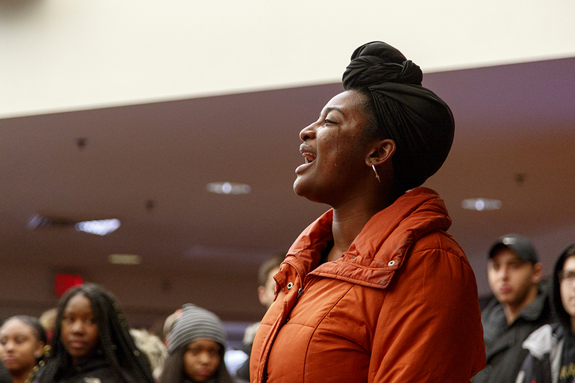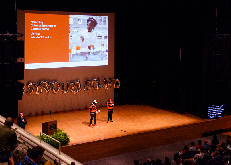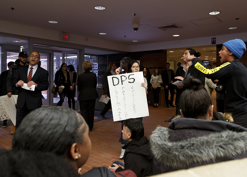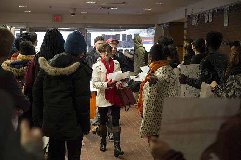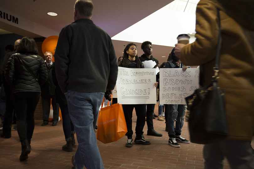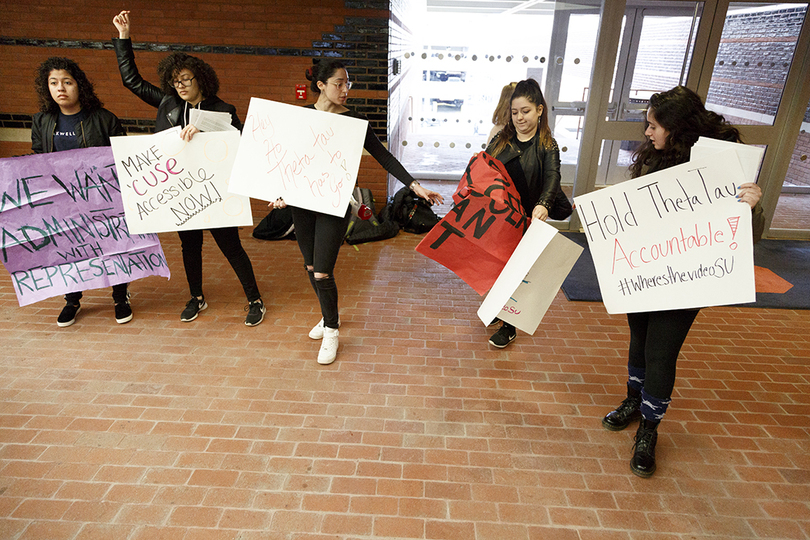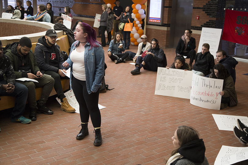 Students began protesting Friday at 7 a.m. in Schine Student Center after Syracuse University suspended Theta Tau, a professional engineering fraternity, after a video surfaced with students using racist, homophobic and anti-Semitic slurs. Recognize US, a student group, presented a list of demands to Chancellor Kent Syverud at the sit-in. Friday is one of Syracuse University’s Spring Reception days for accepted students.
