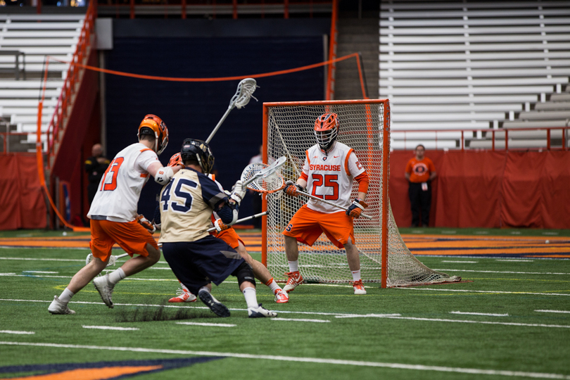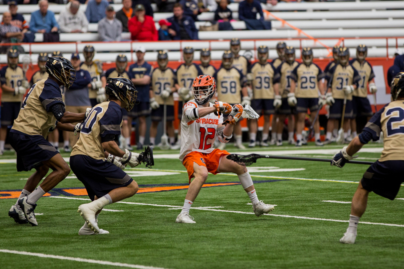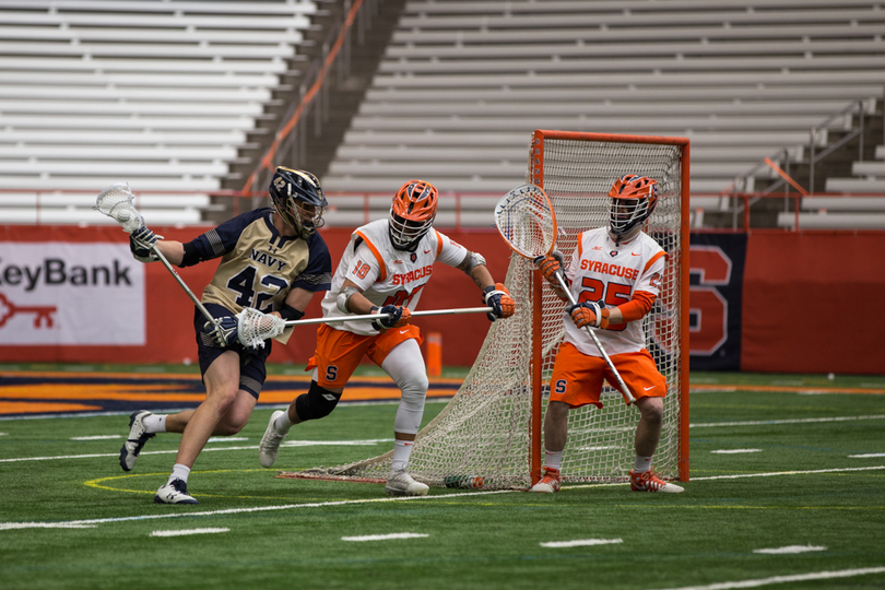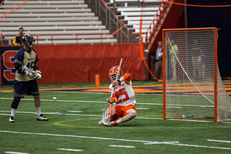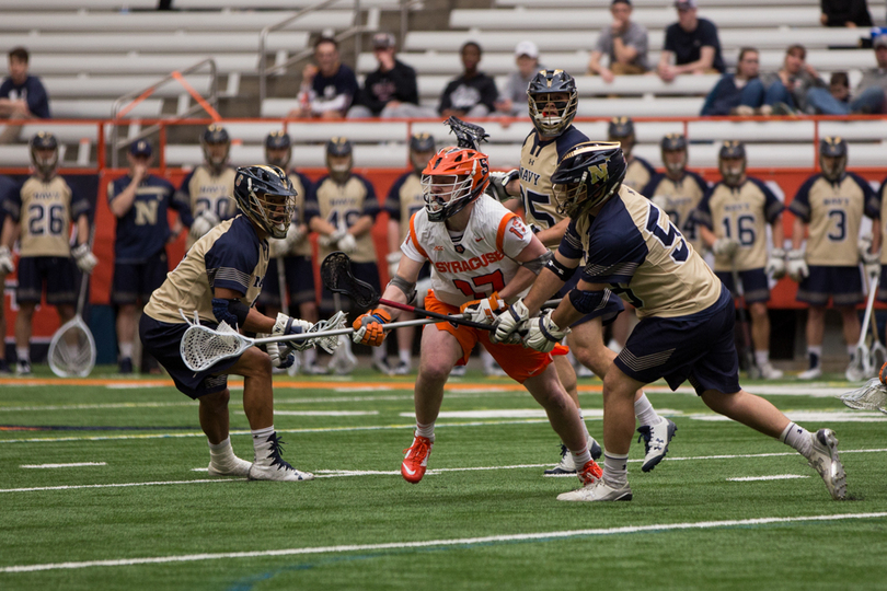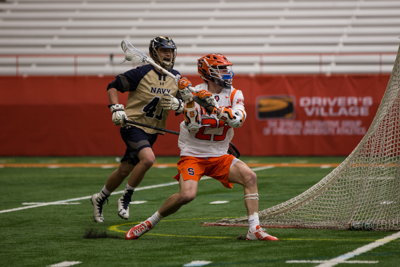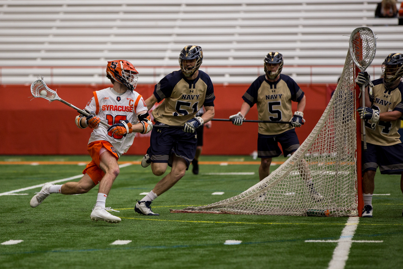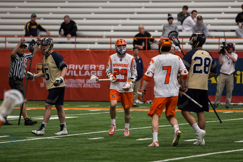 Joe Varello and brother Danny Varello faced off on Saturday, with the elder brother, Joe, getting the better of his young brother in No. 9 Syracuse (7-5, 4-0 Atlantic Coast) 13-12 loss to No. 14 Navy (9-4, 7-1 Patriot). Syracuse sophomore attack Stephen Rehfuss tied a program season-high with seven points while Navy’s Jack Ray notched six points. SU’s Dom Madonna made 11 saves in the loss.