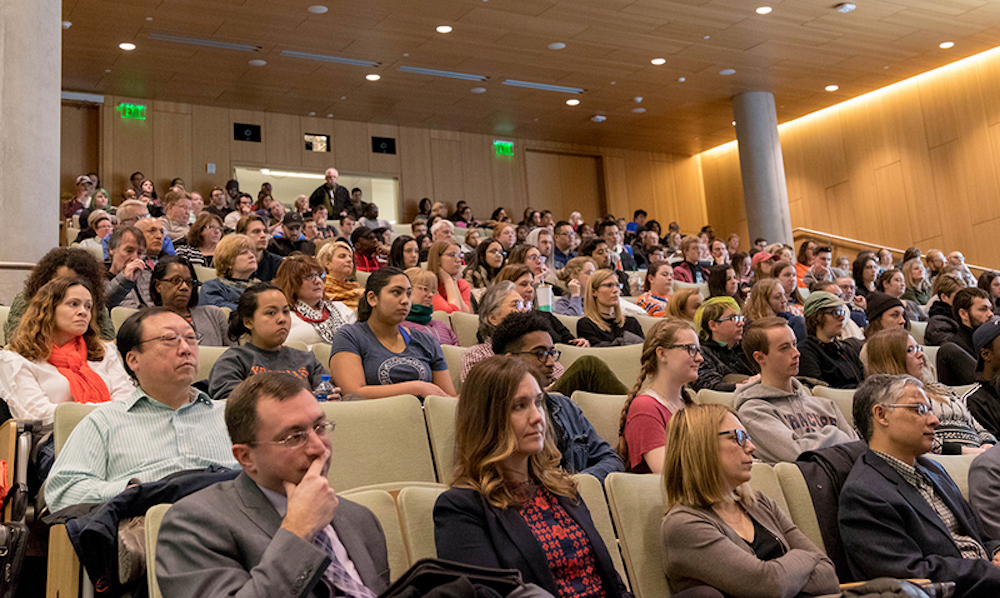 More than 400 people fill Hendricks for the second of two forums on April 18. Then-SA President James Franco, then-SA Vice President Angie Pati and other students speak at the forum, which lasts more than three hours. Students at the forum say they have experienced racism at SU in the past and question why Syverud did not attend the second forum.