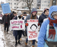 This year, more than 100 protesters filled city sidewalks as they marched through the snow from the James M. Hanley Federal Building to the United Methodist Church.